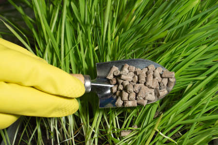Fertilizing the garden by bio granular fertilizer for better conditions of garden, gardening concept