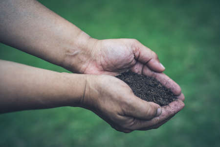 Ecology concept. Close up female hand holding organic soil full of natural matter above the dark green grass background.