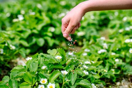 Farmer giving granulated fertilizer to young strawberry plants. Hand fertilize organic garden.Blooming strawberries