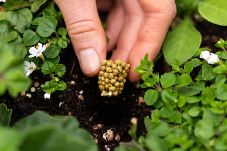 Fertilizer for flowers. Close-up of a gardeners hand in a glove fertilizing flowers in the street. The process of planting flowers in pots on the terrace