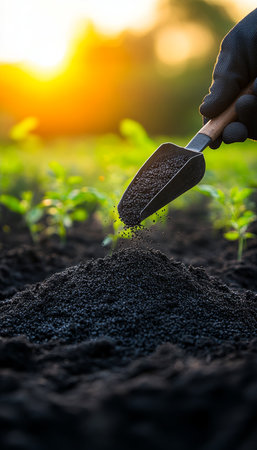 Nurturing Growth Nutrient-Rich Soil Added to Garden at Sunset, Promoting Sustainable Living.