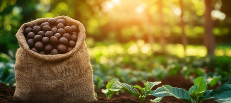 Fertilizer bag in garden with young green plants and fresh soil. That the image is generated using AI.