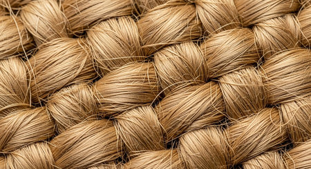 Detailed close-up view of intertwined natural fibers showcasing warm golden tones and intricate textures, ideal for design projects, textile applications, or artistic inspiration