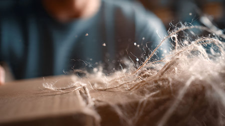 Macro shot of camel fur texture, coarse and thick golden-brown fibers adapted for desert climates.