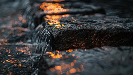 This image showcases water flowing over textured dark stones. The close-up perspective emphasizes the water's movement and the stone's rough surface. Warm, orange highlights add contrast to the predominantly dark composition. The style suggests a natural environment suitable for artistic, design, or commercial projects requiring a sense of tranquility.