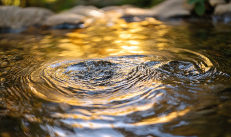 Close-up of clear water flowing gently over smooth stones in a serene stream, with sunlight glistening on the surface