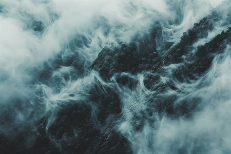The is of a mountain range with a thick fog covering it. The fog is so dense that it obscures the entire mountain range, creating a mysterious and eerie atmosphere