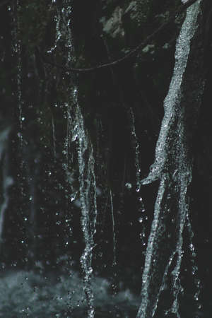 Water drops fall into a small stream in the forest. Nature background