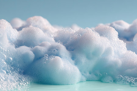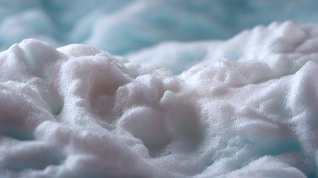 This image captures the delicate beauty of white soap foam resting on an aqua surface, showcasing the soft textures and intricate patterns, perfect for wellness themes.