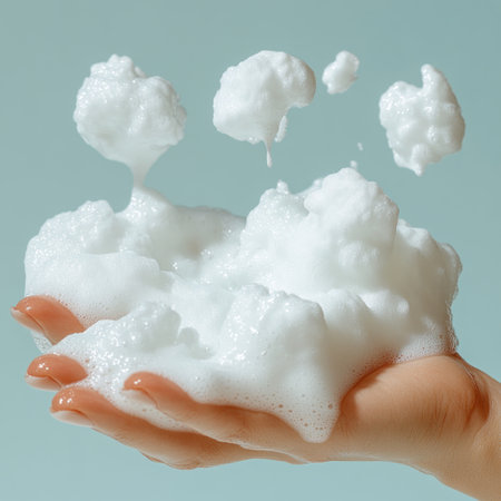 Close-up of a bar of soap covered in fluffy, white foam bubbles, glistening under soft light.