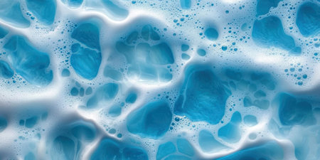 White and blue soap foam. Lather with many small bubbles. Laundry cleaning or sea wave background.