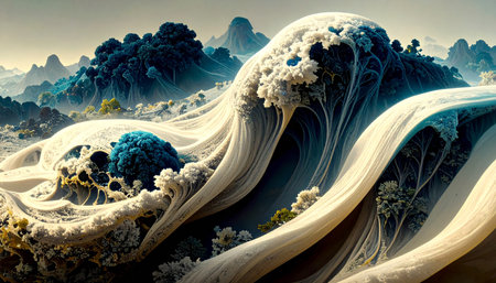 The image is a beautiful representation of a wave, with its peaks and troughs captured in a way that makes it look like a work of art. The colors are soft and calming. AI generated