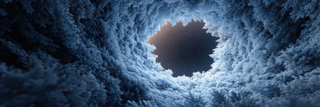 Frozen Fractal Abstract Winter Scene, Glowing Nautilus-shaped Ice Spire, Blue, Cold, 3D Render