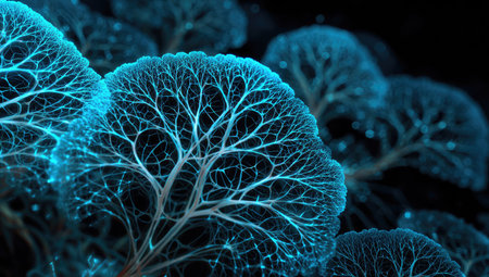 An abstract artwork showcases luminous, interconnected networks that visually resemble trees, rendered in vibrant shades of blue against a dark backdrop. The composition features a close-up perspective highlighting the intricate textures and flowing lines. Suitable for a variety of creative projects, including digital art and editorial content.