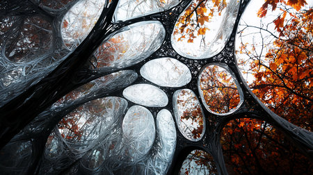 A complex structure featuring black, web-like framework enclosing clear, cell-shaped sections, creating a unique organic and architectural design.