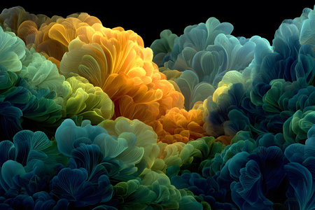 Colorful organic shapes with soft textures create a dynamic abstract landscape. the harmonious blend of warm and cool colors forms intricate patterns, evoking a sense of depth and movement, perfect for digital art and design projects. Generative AI