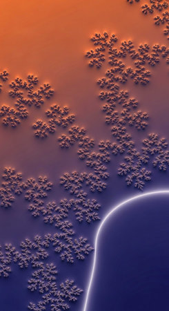A vibrant fractal design with snowflakes and a glowing curve on a gradient background