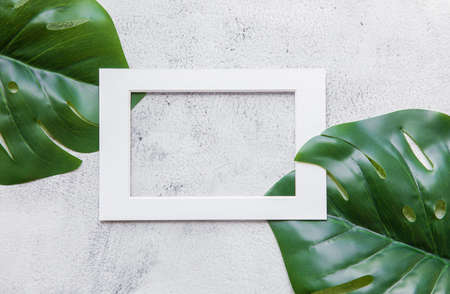 Green monstera palm leaf nature with white frame text box for presentation background or texture - natural or environment concept