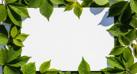 A square frame filled with a white background, surrounded by a variety of green leaves. The leaves are arranged in a neat, symmetrical pattern, creating a natural and refreshing border.