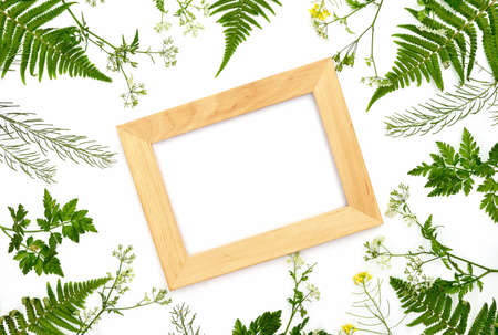 Empty wooden photo frame mock-up with green leaves around, isolated on white background