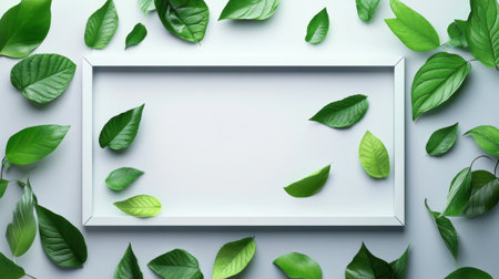 Lush green leaves surround a blank frame, creating a soothing and elegant space ideal for showcasing eco-friendly themes, nature inspirations, or fresh designs.