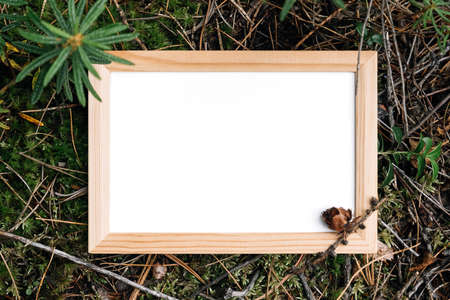 Wooden frame with white blank card on green natural background in forest. Top view Flat lay Mockup.