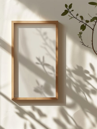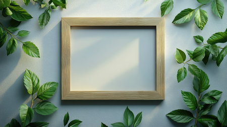 A wooden frame sits empty on a textured surface, surrounded by lush green leaves. Soft natural light filters in, highlighting the frame and creating a serene atmosphere. The scene evokes a sense of calm and creativity.
