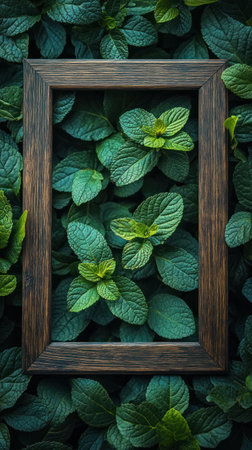 Vibrant mint leaves nestled within a rustic wooden frame create a natural masterpiece.