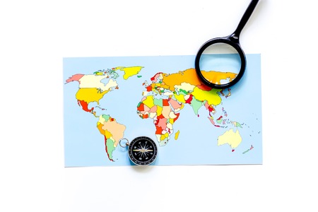 Planning trip. World map and compass on white background top view copyspace