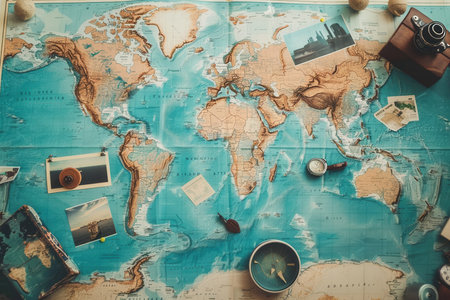 Colorful travel photos arranged on a world map background create a nostalgic ambiance for adventurers and explorers.