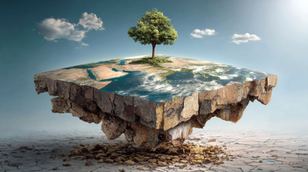 Layered textures in stone and earth show the development of civilization, highlighting a landscape with a tree symbolizing growth and continuity.
