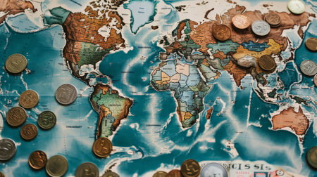 Coins and currency notes of different countries spread out on a map