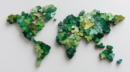 Earth made of green puzzle pieces, a few missing, symbolizing collaborative ideas to solve global issues with space