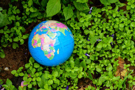Globe on the green moss in the forest. Elements of this image furnished by NASA