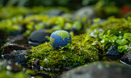 Earth globe on mossy rocks, vibrant green background, nature concept, environmental awareness, water droplets, lush greenery, peaceful scenery, macro photography, global perspective