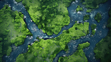 There is an aerial view of a devious river in fields. Image generated with Generative AI