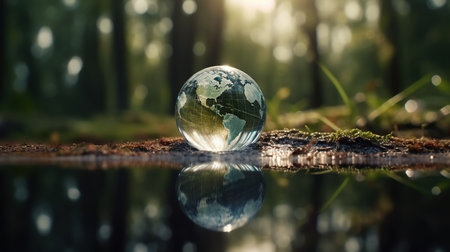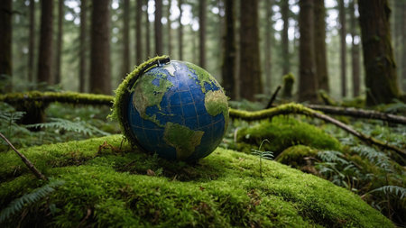 A globe showing Earth's continents is placed on a vibrant moss bed in a dense forest. The image emphasizes our planet's beauty, the richness of nature, and the interconnectedness of all life. A striking reminder of environmental conservation. AI generated image