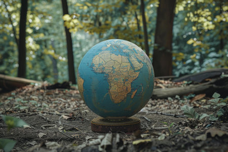 Globe showing africa is standing on the ground in a forest with the sun shining through the trees