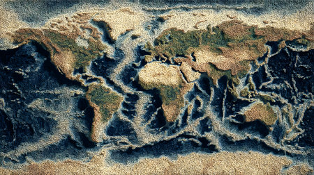 Topographic world map illustrating elevated mountain ranges, snow capped peaks, and geographic features for global understanding