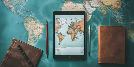 Tablet displaying world map placed on a vintage map with notebooks and pens, symbolizing travel planning and exploration.