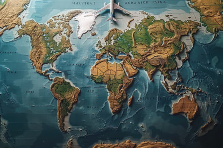 Airplane flying over a detailed and textured world map with blue oceans