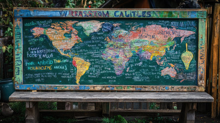 Vibrant chalkboard featuring a hand-drawn world map filled with creative annotations, set in a charming outdoor space, perfect for education and inspiration.