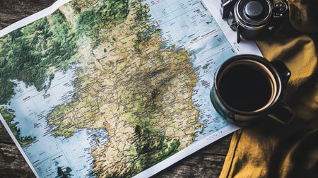 Explore a captivating topographic map spread across a rustic wooden table, complemented by a vintage camera and a steaming cup of coffee, creating an inviting travel scene.