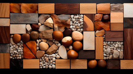This modern abstract composition features a harmonious arrangement of geometric shapes with natural textures and colors, ideal for artistic projects and creative inspiration.