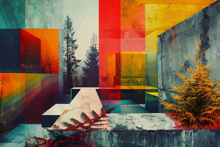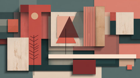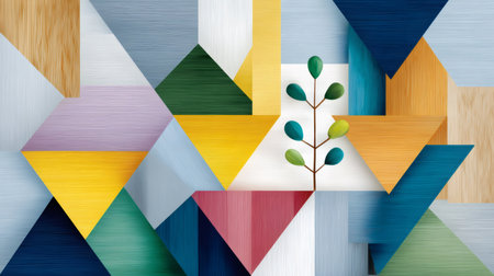 Colorful geometric shapes and wood textures creating an abstract pattern with a stylized plant