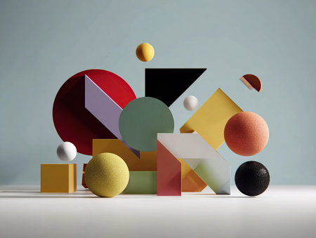 Abstract still life arrangement featuring colorful 3d geometric shapes