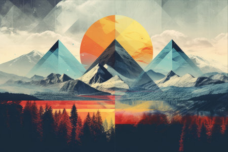 Geometric collage creating surreal landscape with transparent background