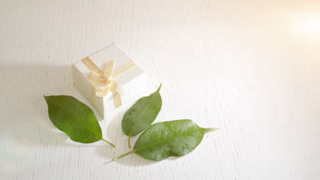 Festive packaging with a gift next to green leaves of ficus on a white wooden background