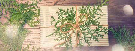 Closeup eco gift box with twine box in front of christmas decorations, wide photo