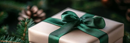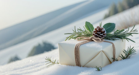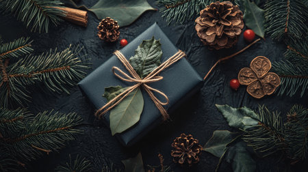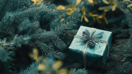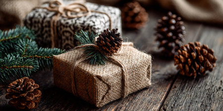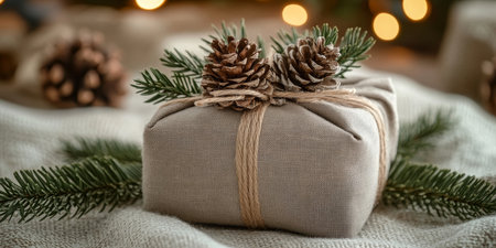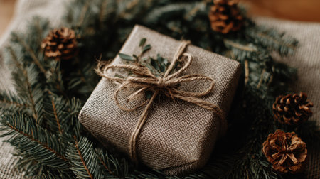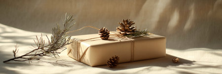 Elegant gift box adorned with natural pine branches, cones, and twine, set against a soft holiday background, perfect for New Year gifting photography